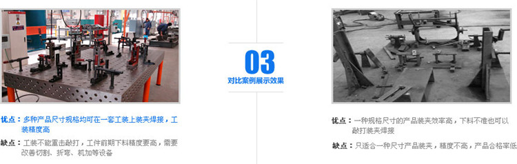 4、重復性:臺面有鑄鐵/鋼結構件/高精度加工件/模塊化組件組合而成,其性能非常穩定,如使用不當造成部件損壞時,也不用報廢整張臺,只要非常少的成本就可以更換單個部件。焊接平臺經過特殊加工處理,在焊接過程中,僅需低廉的防飛濺液即可免除工作臺表面的焊接飛濺。